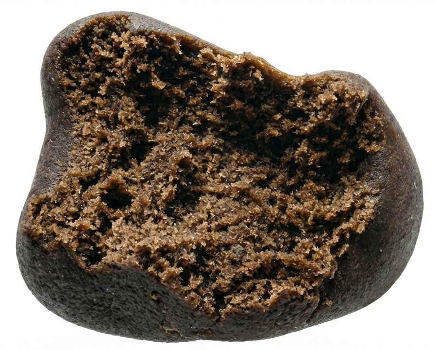 D’une teinte brun foncé aux reflets acajou, ce hash se présente sous une forme ronde (temple ball), compacte et dense. Sa texture, légèrement granuleuse en surface, révèle la richesse de ses trichomes. Sous l’effet de la chaleur, il s’assouplit progressivement, libérant toute sa matière résineuse.